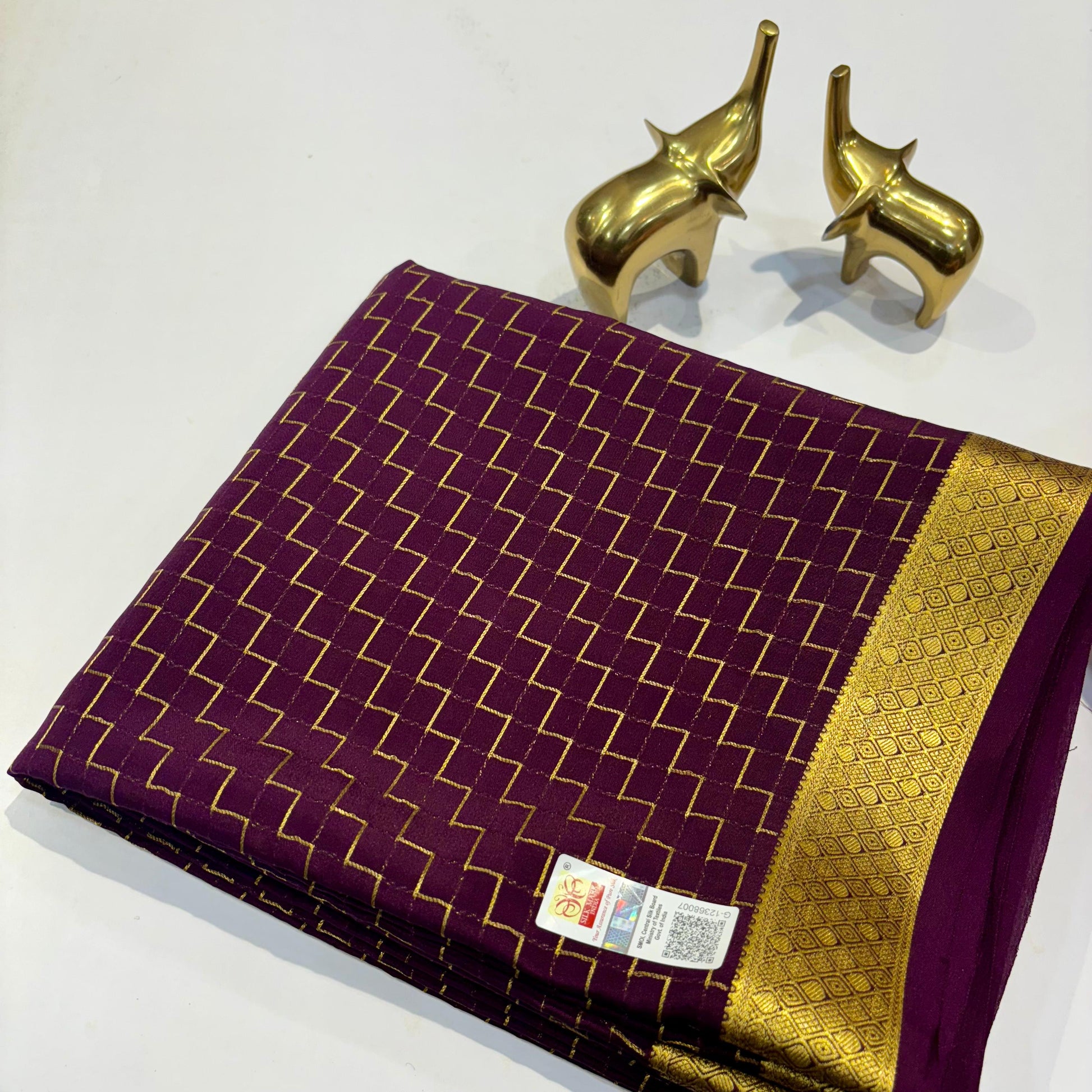 Introducing the elegant Pure Mysore Silk Saree from Raj Silk Villa, featuring a stunning zigzag pattern in self colors. This saree, with its rich texture and vibrant self colors, combines traditional grace with a modern twist. Crafted with a 120-gram thickness, it offers both comfort and a luxurious drape, making it perfect for any special occasion.